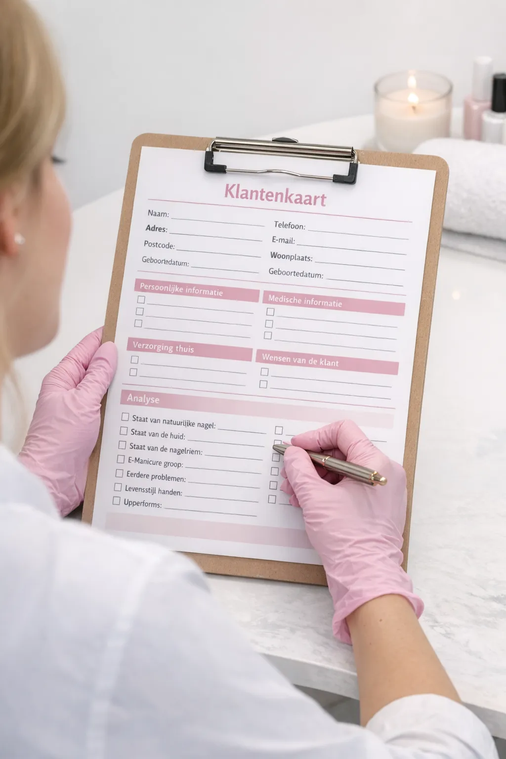Een uitgebreide klantenkaart waarmee je nageltype, huidconditie, levensstijl en wensen van je klant vastlegt.